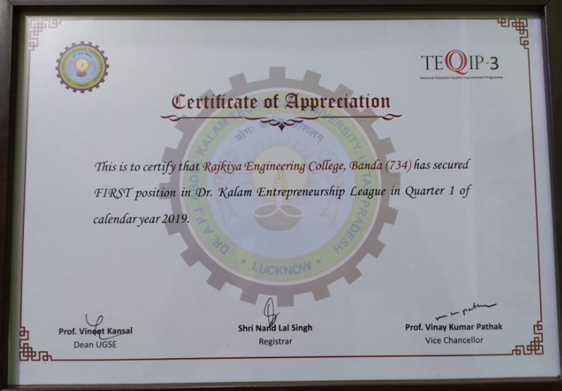 REC Banda secured First position in Dr. Kalam Entrepreneurship League in Quarter 1 of calendar year 2019 for their activity related to start-up and entrepreneurship.