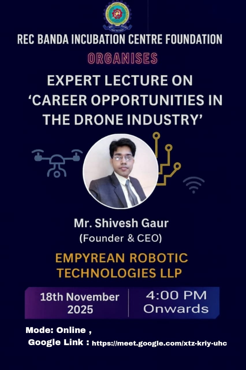 The Expert Lecture on "Career Opportunities in the Drone Industry" delivered by Mr. Shivesh Gaur, Founder & CEO,Empyrean Robotic Technologies LLP., organised by the REC Banda Incubation Centre Foundation on 18th November 2025 (Online Mode).