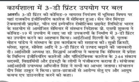 It was successfully conducted in collaboration with Shenzhen Mingda Technology Co. Ltd, China and Empyrean Robotics Technology Pvt. Ltd, India. Speakers of webinar Mr. Sam, Ms. Christy Lv, Ms. Theresa Guo, Mr. Suraj Yadav and Mr. Shivesh Gaur elaborated about the Utility, Importance and Significance of 3D Printer and its product and also showed the Demo of Printer and its production work.