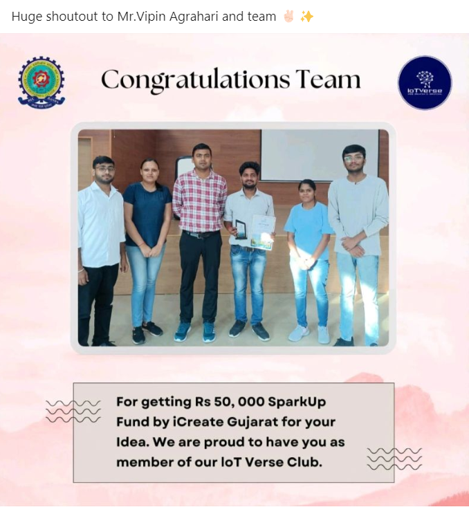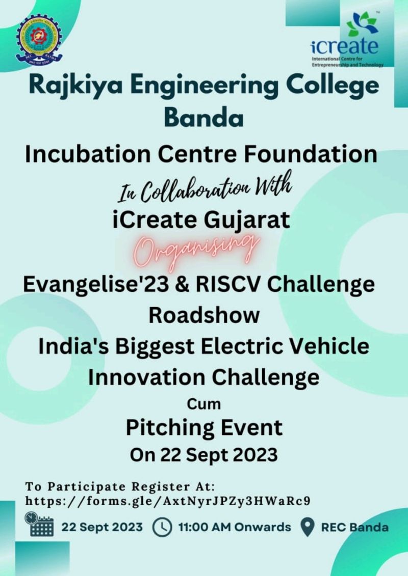 EVangelise '23 Roadshow cum Pitching Event organized by "REC Banda Incubation Centre Foundation in Collaboration with i-create Gujarat" on 22 Sept.2023. In which our Student Team was selected for 50,000/- for Sparkup Grant from i-create Gujarat
