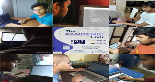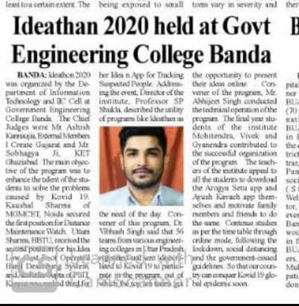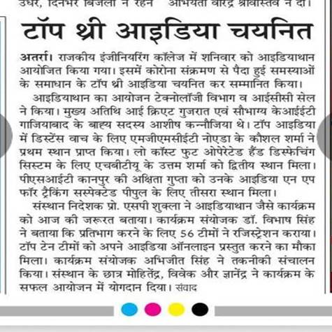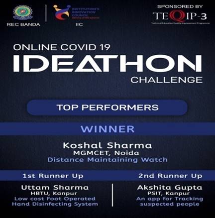 Theme: Ideas for maintaining Social Distancing in college, hostels and classes after COVID-19 and suggestions for fighting against Corona. During Covid-19 Ideathon was an online short, intensive, brainstorming event to help young talents generate fresh solutions to existing challenges. 56 teams have registered and submitted their ideas for this event. Top 10 ideas were selected for second round which was held on 11 June 2020. The Chief Judge was Mr. Ashish Kanaujiya External Member I Create Gujarat and Mr. Saubhagaya KIET Gaziabad. Kaushal Sharma of MGMCET Noida secured First position for his idea of 'Distance maintaining watch', Uttam Sharma of HBTU Kanpur secured second position for his idea of 'Low cost foot operated hand dispensing system' and Akshita Gupta of PSIT Kanpur secured third position for her idea on 'An app for tracking suspected people'.